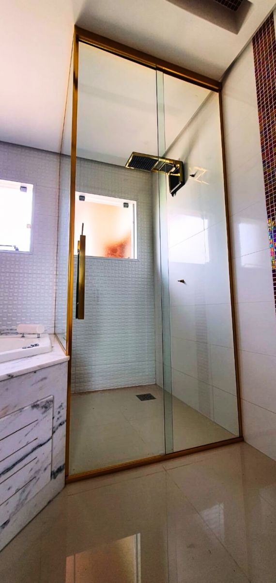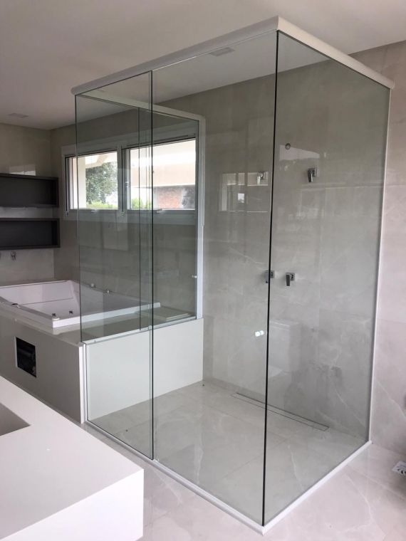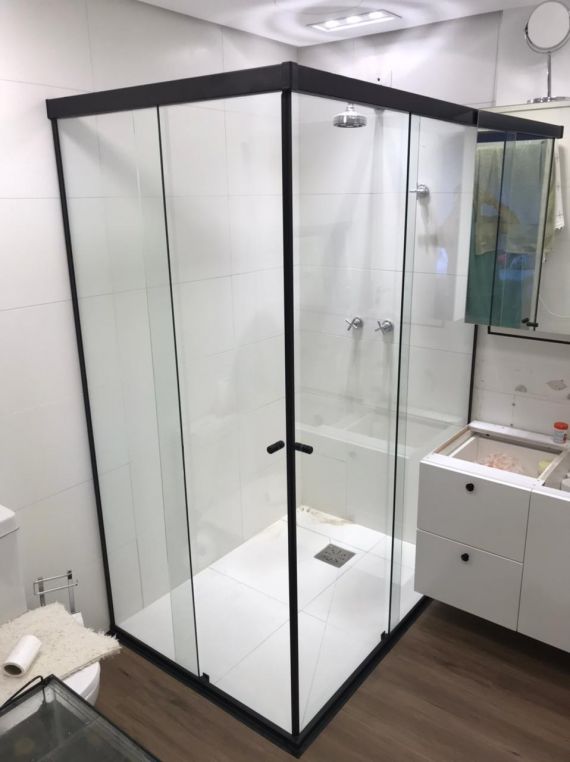 Box de canto ou em 'L' são os boxes com abertura central, ou seja, as portas ficam onde canto se encontra. Podem ser feitos na altura padrão de 1.90 ou até o teto. O acabamento em alumínio pode ser o tradicional (arredondado) ou quadrado (reto).