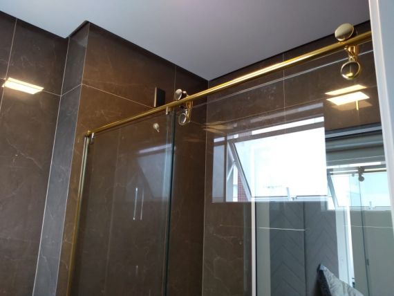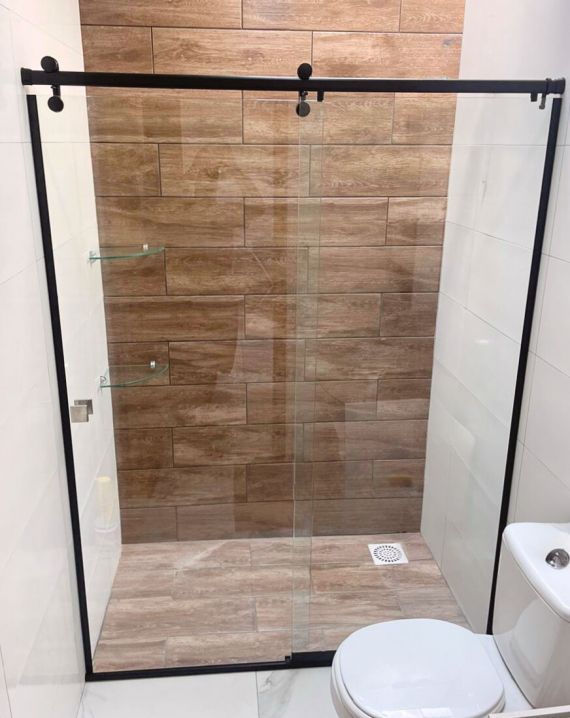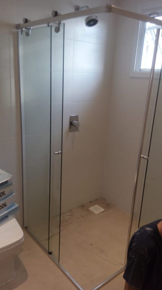 Box elegance é o modelo onde as roldanas ficam aparentes. Esse sistema pode ser usado em box reto e de canto, na altura padrão de 1.90 ou até o teto sendo no máximo 2.55.